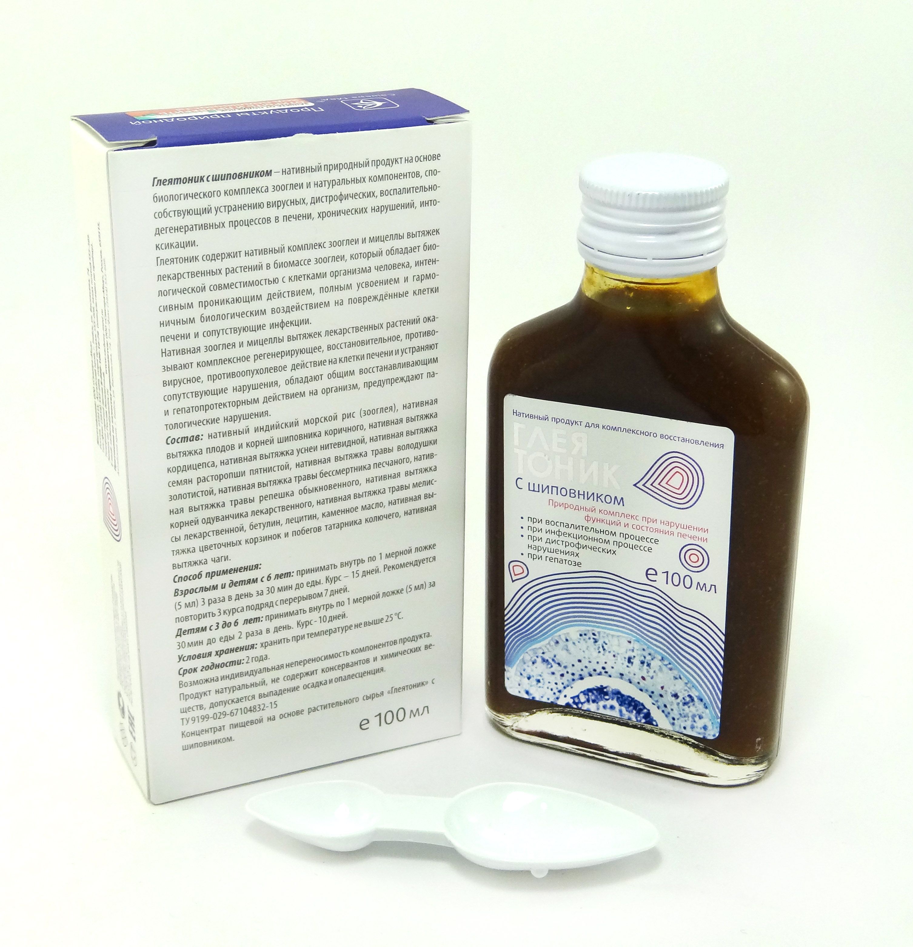 «Глеятоник» с шиповником – нативный природный продукт на основе биологического комплекса зооглеи, эковытяжек из лекарственных растений и природных компонентов, оказывающий выраженное гепатотропное, геропротекторное, противовоспалительное, противовирусное, регенерирующее, противоопухолевое действие на клетки печени и органы пищеварительной системы.